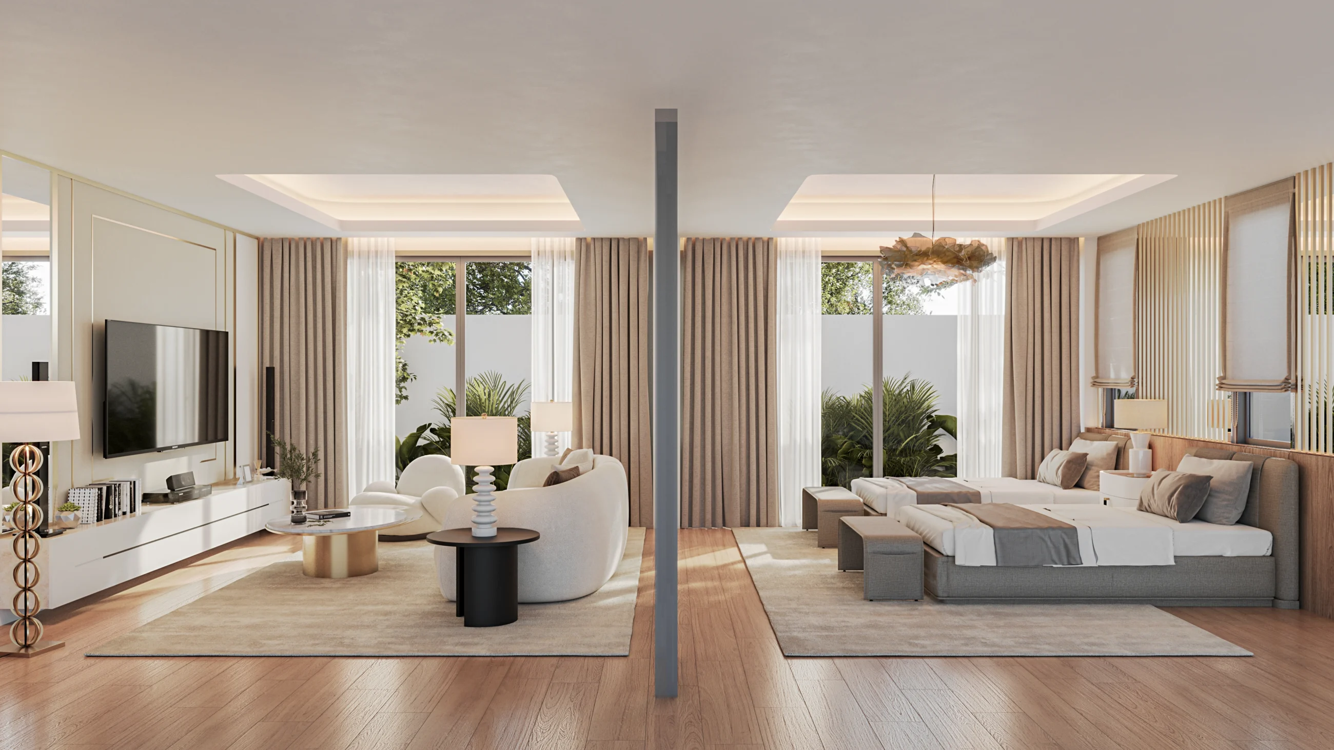 Seamless integration with nature, Every moment is a blissful retreat, with design elements that blend nature into every corner of your home, creating perfect harmony and tranquility. Relax and unwind from the fatigue, with two spacious master bedrooms designed for ultimate comfort, allowing every family member to rest fully. A space for living with a spacious living room, where everyone can come together, share stories and emotions, making the concept of home even more complete.